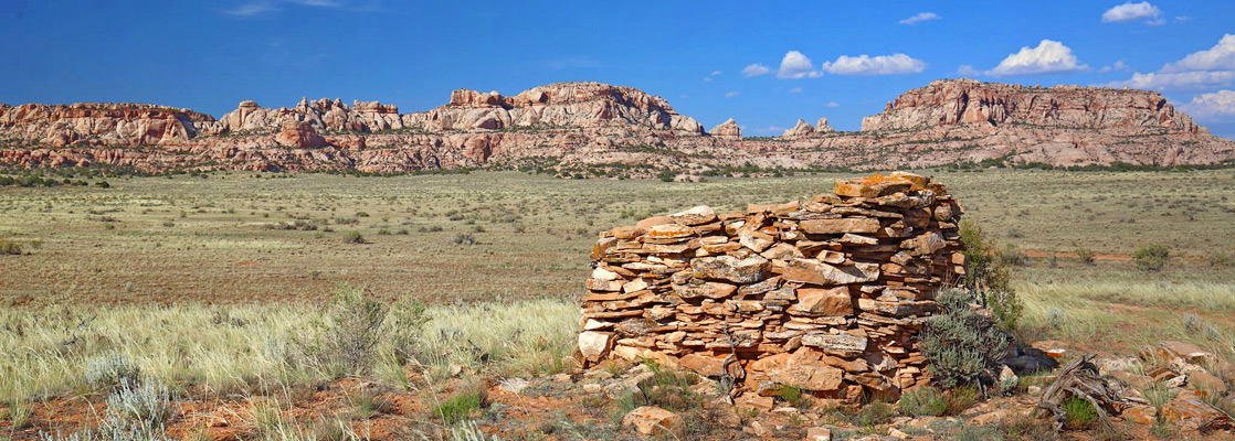 Remote, hard-to-reach region of grassland and isolated red rocks, between Canyonlands National Park (the Needles) and the Abajo Mountains, containing ancient ruins, rock art and other historic artifacts
